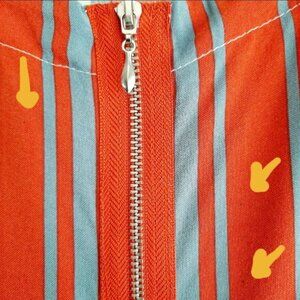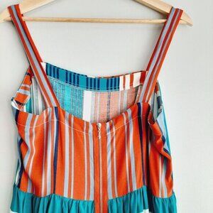 • Lightweight summer dress in red, white and blue stripe pattern. Unlined with back zip closure.