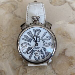 Absolutely stunning! So unique and bold, you’ll get nothing but compliments when you wear this gorgeous watch! GaGà Milano, 48mm watch featuring a white enamel dial, steel numbers in applique and steel hands. White croc embossed leather strap. The back is clear so you can see the movement, amazing!!