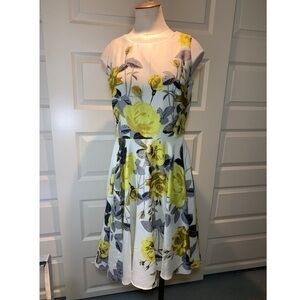 Gabby Skye Fit-N-Flare Midi Dress Off White Floral Yellow Roses 50's Style Gown