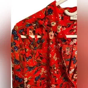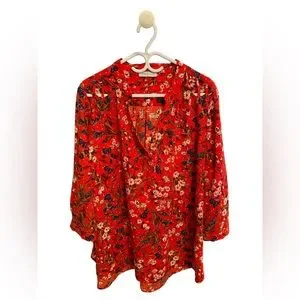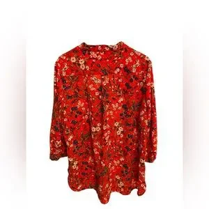 Fashion printed top. 3/4 sleeves, v-neck button closure with detailing on top of both shoulders. Hi-low effect, splits on both sides, pleating design on front and back. 1 button closure on cuffs. Some stretch, like new, in good condition. Pit to pit measures 26”