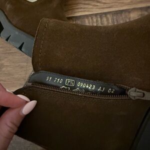 Stylish chocolate suede booties with side zipper. Durable chunky sole.
