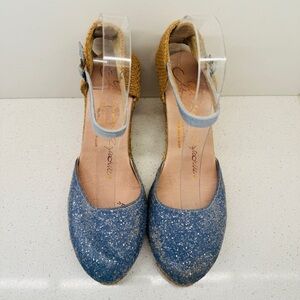 Gaimo Espadrille Wedge Leather Blue Sparkle Ankle Strap Heel Sandals Spain Sz 40