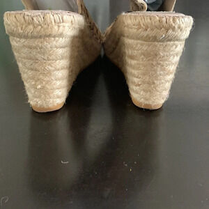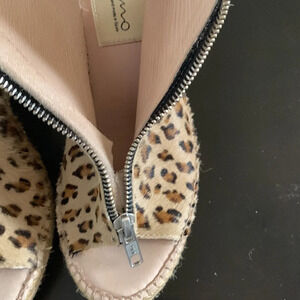 Gaimo karim leather calf hair leopard print espadrilles wedge sandals open toe. In great condition, one of the shoe lining near the toe came off but does not affect the shoe and is hidden when zipped up. Please see photos. Measurements are approximate.