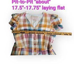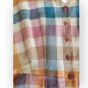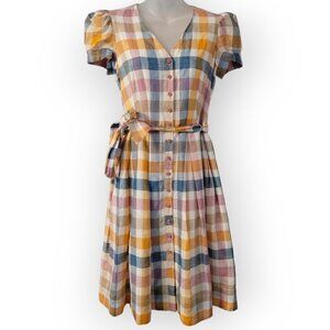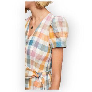Gal Meets Glam Linen Puff Sleeve Plaid Midi Dress Pockets Tie Waist Size S