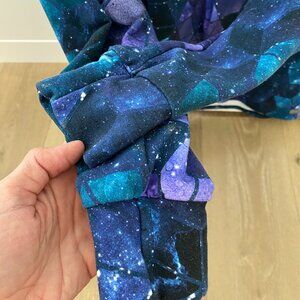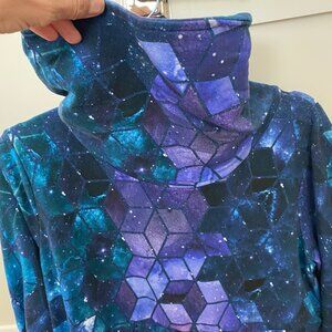 It is thick material and VERY well constructed. Matches everything and is super comfortable. It can fit loose small or a fitted XL. I wore it post baby and was a size 12 and it was slightly fitted, and I'm a size 8 now and it hangs beautifully. The front has a spectacular hemline. If interested I think I can find the ones my kiddos had (fit 1 & 3 year olds). Same style different colours. This reminds me of space, galaxies, and cosmic designs - so pretty.
