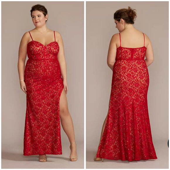 Dripping in sexy details, this allover lace sheath features a sweetheart neckline, corset-inspired bodice, and thigh-high skirt slit. It's versatility should be celebrated, so debut (or rewear!) this style as a wedding guest dress, prom dress, or formal event attire.