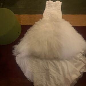 This is a dream! The sculpting in the braided bodice, the lush marshmallow ruffly explosion thereafter, the high low cut allows for plenty train to be carried. Even though strapless, this dress offers plenty support and is meant to fit tight.