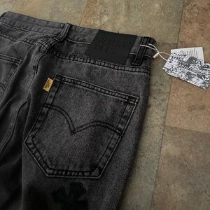 Chic denim jeans with a unique black and gray pattern. Ideal for a modern style. Comes with all tags! Size 30 waist tight fit jeans
