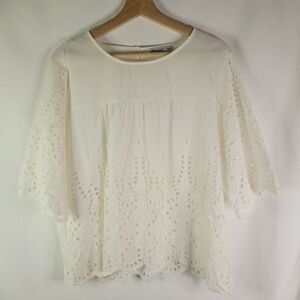 Gallery from Dunnes Stores romantic top with intricate white lace details. Versatile for dressing up or down. 3 quarter length sleeves. Button and loop closure at keyhole rear neck opening. 100% Cotton. EUC.