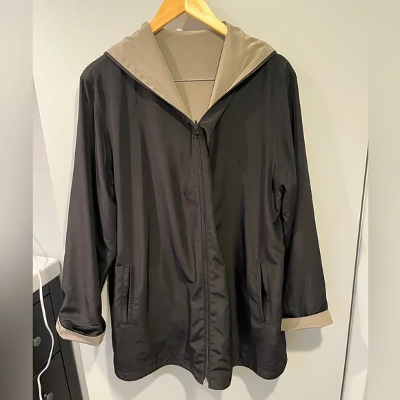 Gallery black and beige reversible jacket with front zipper and pockets and a hood.