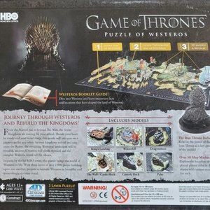 4D Cityscape now introduces the official puzzle guide for Game of Thrones, based on the award winning HBO televisionseries. This puzzle will guide players through the assembly of the map of Westeros in a patented multi-layer design. The first layer is a 1000+ pieces jigsaw puzzle that will teach you all about the various locations and regions of Westeros. The second layer is an artistic 200+ pieces jigsaw puzzle that replicates the current landscape based on the famous introduction of the television series. The third layer adds the 3D miniature replicas models that you insert into the puzzle, which include famous cities and castles such as Kings Landing, Winterfell, Eyrie, the Wall, and more! In addition, the puzzle comes with an information booklet that teaches you everything you need to know about Westeros, including over 45 flags to mark famous landmarks, 10 sigils to mark the Houses, and 5 battle markers to learn the locations of five major battles. Intended for ages 14 and up. The fully assembled product measures 30 x 18 x 2 inches