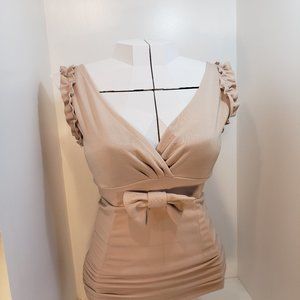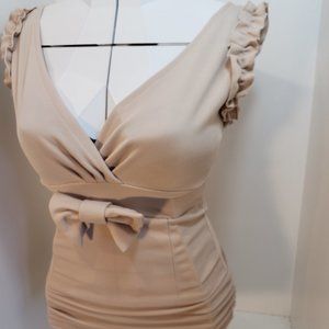 Cream/Beige Dress short and stylish. Can be worn under blazer, sweater, cardigan or shrug. Even though it was never worn, I see a few little black specks of something on the top of the dress, I haven't tried to wash it out yet, sold as is