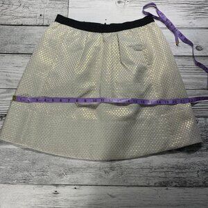 Elevate your wardrobe with this stunning Ganni Anthropologie Cressida Brocade skirt. The gold metallic fabric is accented with pleats, glitter, and a zipper closure for a unique and stylish look. The A-line style and contrasting elastic high-rise waist make it perfect for any occasion, from casual to formal, and the pockets add a touch of practicality. This skirt is made from a twill fabric that is a combination of polyester, metallic, and cotton, and it is machine washable for easy care. It is available in size small and is suitable for women of all ages. Add this skirt to your collection and make a statement wherever you go!