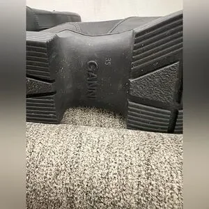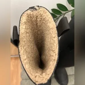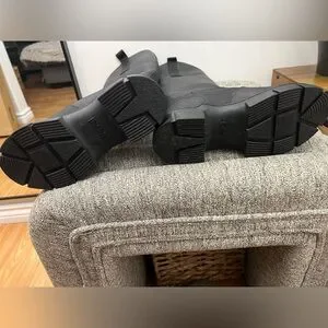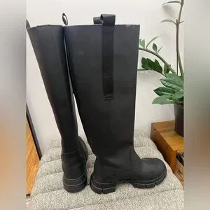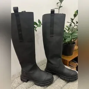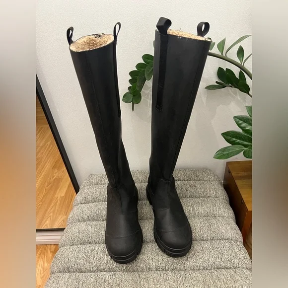 Ganni rubber and shearling lined country boot. Size 35. Worn once. black recycled rubber knee high Country boots featuring rounded toe, pull on entry, pull tabs at sides of topline, beige shearling interior, and lug sole.