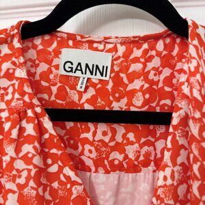 It is in excellent, like-new condition. Measurements for size 38 are length 121 cm, Chest 92 cm, Waist 74 cm, and Hips 94 cm. It is lined outside of the sleeves. It is machine washable. It's so lovely. #Ganni #FloralDress #MidiDress #Size38.