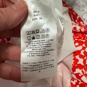 Ganni Midi Dress in Mini Floral Orangedotcom, size 38. It features a plunging V-neckline, but if you want more coverage, I had a closure sewn in for added modesty. It features lovely sleeves and a very flattering cinched waist.