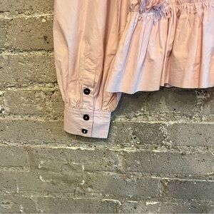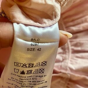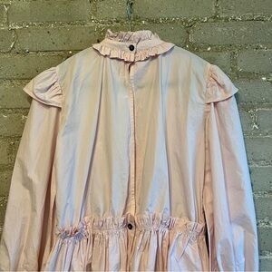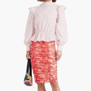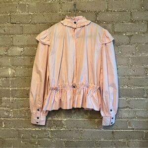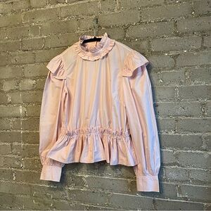 This elegant Ganni blouse showcases a soft pink color with long sleeves and a distinctive bib collar. The ruffled peplum design adds a touch of sophistication, making it a perfect choice for a stylish and refined look.