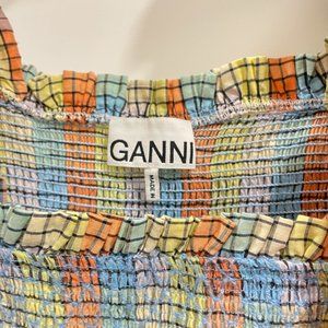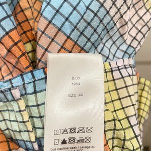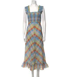 A-line long dress. Blue, orange, yellow and black plaid print. Ruffles on straps and hem with smocked bodice and straps making it very stretchy. Invisible zipper under left arm. Cotton and poly blend with not a lot of stretch in the body.