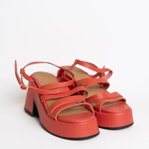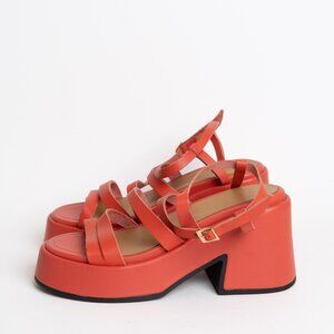 Bold red platform sandals by Ganni. Strappy design with a chunky heel. Perfect for a statement look.