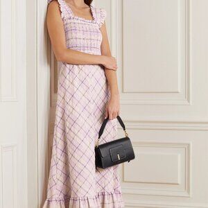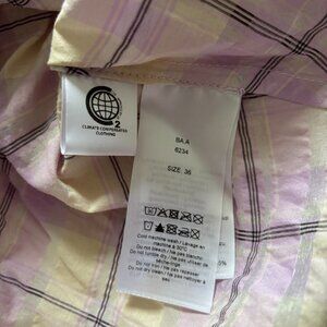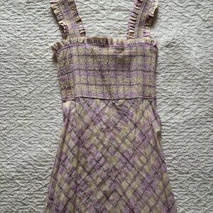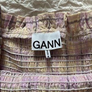GANNI's signature dress in checkered lilac and cream seersucker, featuring a stretchy, shirred bodice and straps and a flouncy ruffled hemline, size 36. In excellent used condition. Beautiful lightweight fabric in organic cotton blend with smocked bodice with zipper on the side, perfect for summer. Comes from clean SFPF home, ships fast!
