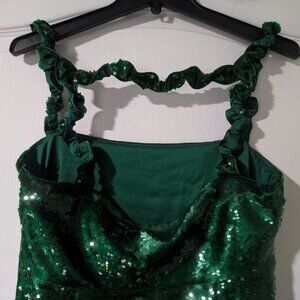 Ganni’s mini dress is destined for the dancefloor. It’s cut from satin that’s saturated with light-catching sequins and has twisted straps for added drama. Complement the 'Kelly Green' hue with gold jewelry and finish with barely-there sandals.