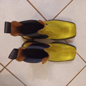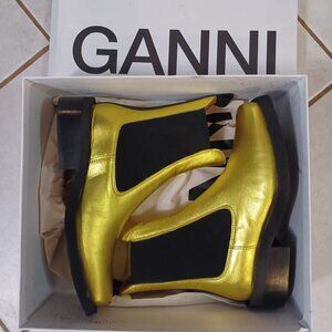 NWT square-toe chelsea boots from Ganni. Metallic yellow-gold colour, with elastic gore and square heel. Upper material: leather. Size 37. Retail price: $510. Box and dust bag included.