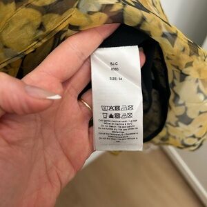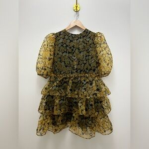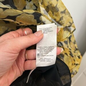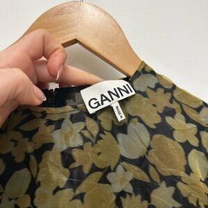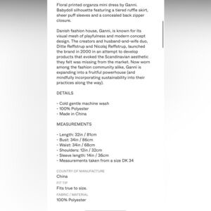 This vibrant yellow mini dress by Ganni features elegant 3/4 puff sleeves and a classic crew neckline, perfect for a cocktail event. The playful sundress style is complemented by its lively color, making it an ideal choice for a wedding guest or a night out.