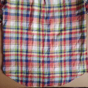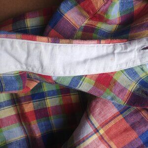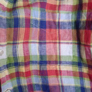 Very good used condition, beautiful linen. The only sign of wear I can find is a couple of faint smidges on the interior collar (not visible from the exterior). Red, blue, green, and white plaid.