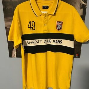 This Gant polo shirt features a vibrant yellow body with a striking black stripe across the chest, showcasing the 'GANT LE MANS' text. The classic polo collar and sporty design make it a standout piece for casual outings or motorsport events.