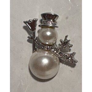 A stylish snowman-themed pin featuring pearl accents and rhinestones, ideal for accessorizing during the holiday season or gifting. Measures 1.5 inches.