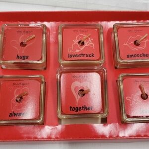 Set of six votive tealight candles in glass with a cinnamon heart scent. Romantic red theme. Perfect for Valentine's Day or any romantic occasion