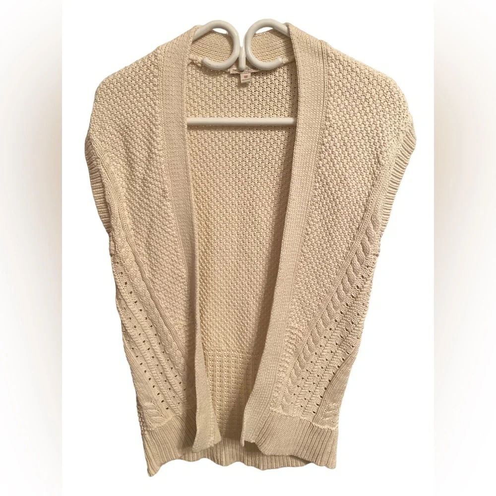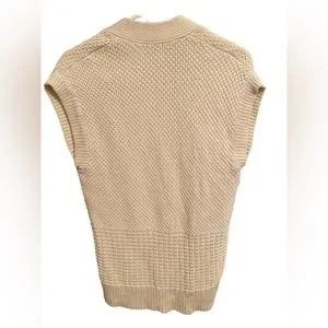 Open front cardigan. Sleeveless, no pockets, zipper or buttons. Thicker knit material with lots of stretch. Gently used, in good condition. Pit to pit measures 17.5” w/o stretch.