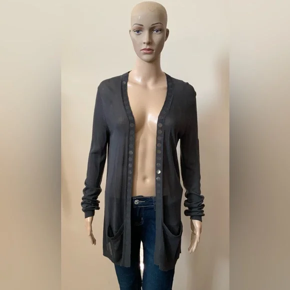 Dark Grey Open Front Cardigan. Shiny Gold Discs adorn the Collar and Down the Front. Two Front Pockets