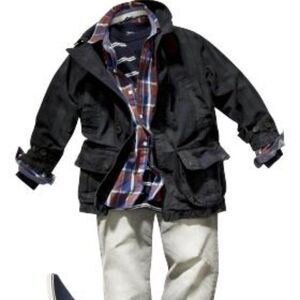 I'm obsessed with this jacket! I think it's soooo styled. Dark teal green highland plaid outer with loads of pockets, brown corduroy trim and elbow patches. Square cut boxy look and soft black cotton inner lining. Perfect for spring and fall, this jacket is going to be your favourite! EUC.