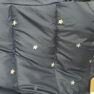 Keep your child warm and stylish with this navy puffer jacket featuring a charming star print. Perfect for cooler days. Water resistant.