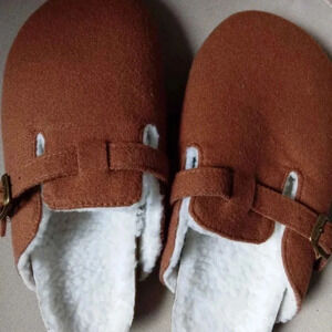 These clogs are made with a faux-suede upper. Cozy sherpa lining. Rubber gripper sole. Buckle at top.