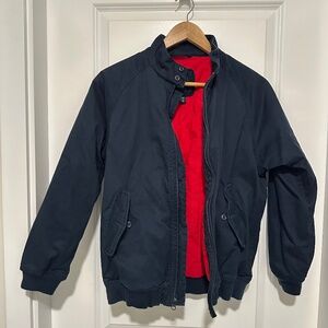 Navy Coloured Utility/ Bomber Style Jacket with Red fabric on inside. Warm, thick jacket. Not waterproof or water resistant.