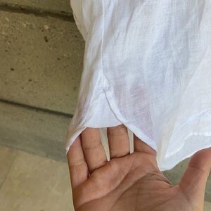 Worn once on one trip out for a day of boating with a cute pair of shorts (also posted, blue stripe ones 😉). Lovely linen top that I wish still fit me but I’ve grown more into being a standard medium. Two flaws to point out that are funny enough roughly in the same location on the elbows left and right respectively. I must have leaned back at some point. 🤷🏽♀️ Have not tried direct spot treating them but the top has been laundered and air dried. Also the tiniest bit of marking at the inside neck, very minimal but wanted to disclose and pictured. Accounted for in price.