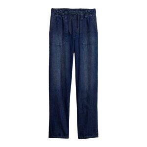 These casual mid rise pants feature an elastic waistband with drawcords, four-pocket styling and easy, relaxed leg. They have no stretch, authentic GAP denim that gets better with every wear. Made to wear all day & break in over time.