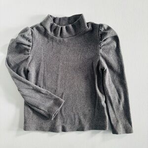 Grey ribbed long-sleeved top with short turtleneck and puff shoulders