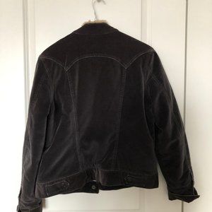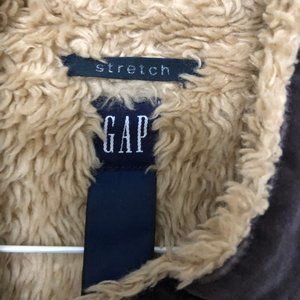 Blue velvet exterior, tan faux shearling lined interior. Snap button closures. Great condition.