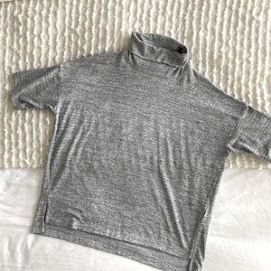 Super soft and chic short sleeve turtleneck with side slits. High low hem in marled grey color. Oversized fit and in new condition! • Materials: 48% polyester, 48% rayon, 4% spandex • Pit to pit: 23.5” • Length: 24” (front) and 25.5” (back)