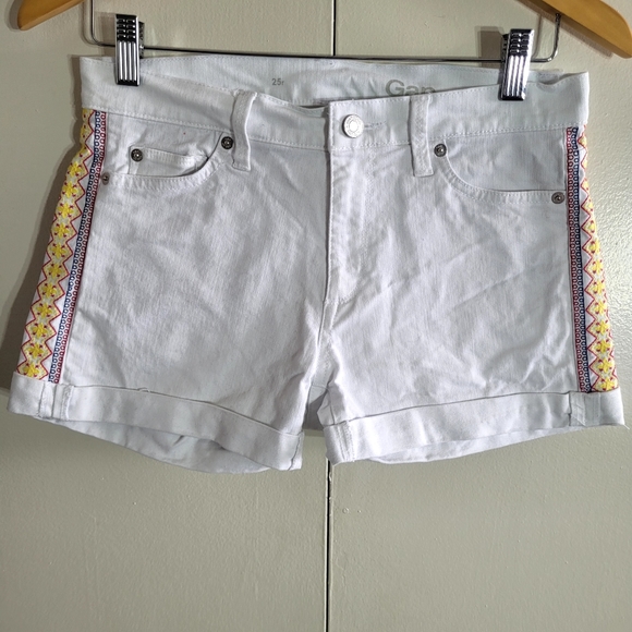 Excellent condition Y2K white Gap denim shorts with colourful Aztec design on the sides(red, navy blue, magenta, and yellow).