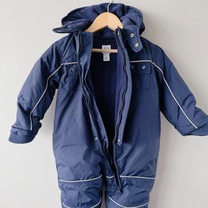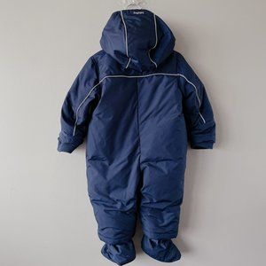 Gap blue one-piece snow suit with detachable booties and hood. Zip up front, zipper works perfectly. Fleece lining. Snow pants and winter jacket in one. Tag size 6-12m.