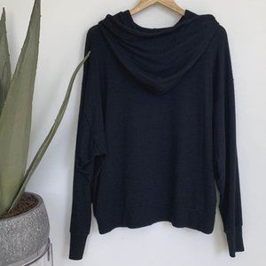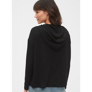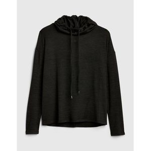 "Soft jersey knit. Dropped shoulders, long sleeves. Drawcord ties at hooded neckline."