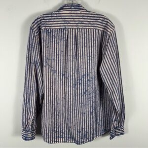 Stylish button-down with blue and cream stripes. Perfect for casual outings. Comfortable and trendy design.
