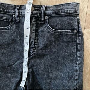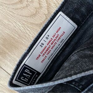 Picturing a pair of womens black acid washed skinny ankle highwaisted denim jeans by Gap in a size 25" waist.
