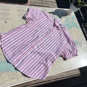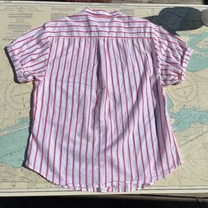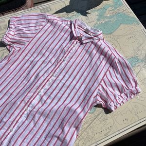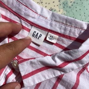 White and red vertical striped shirt made by Gap - in excellent condition. Tagged as a size small, fits bigger. Measures 17.5" across shoulders, 21" pit to pit, 27" long.