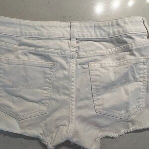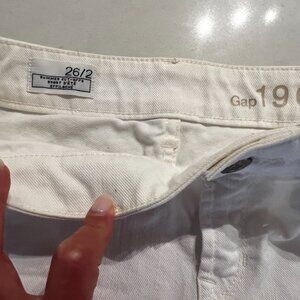 100% Cotton White Denim Cutoff Shorts from The Gap. The waist sits at a mid-rise with a frayed denim detail at the leg opening. Fit is slightly baggy. Cotton material is very thick.
