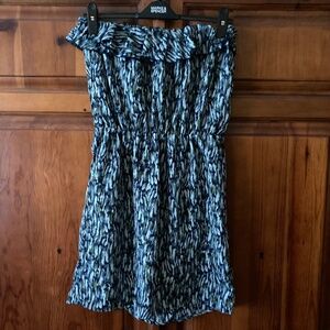 Cute patterned Gap strapless mini dress, front ruffle. Blue silky feel.